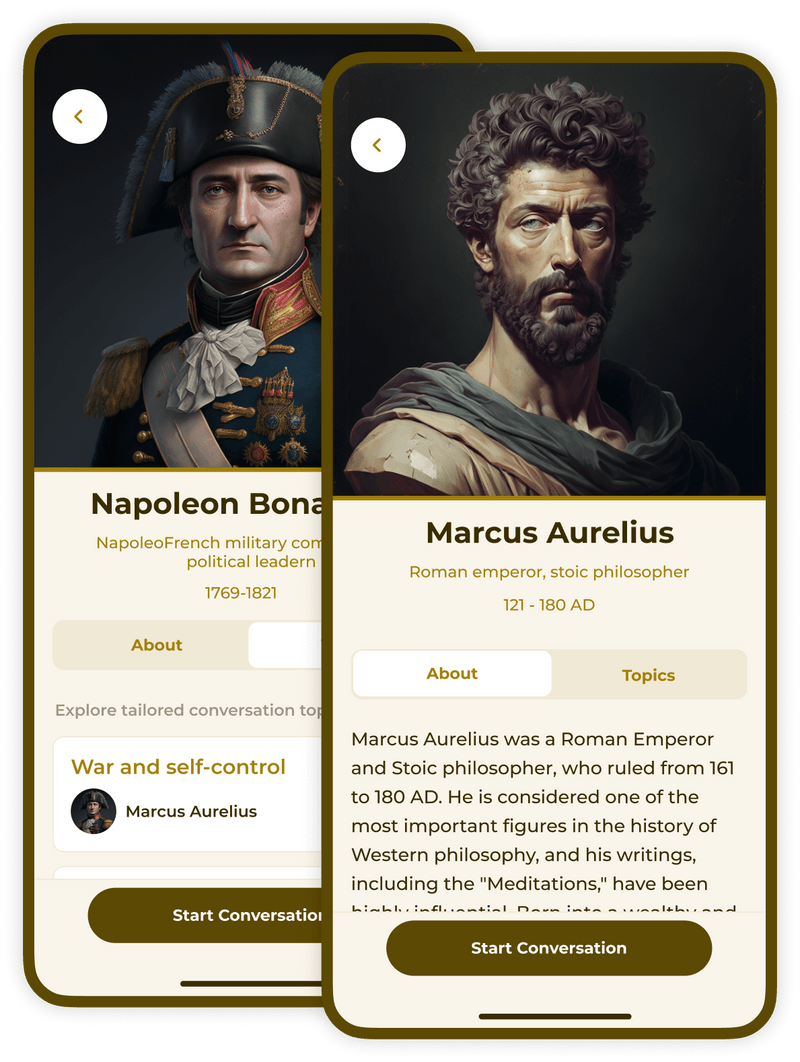 Cada conversación es completamente única, lo que le permite tener una interacción profunda y personal con la figura histórica de su elección. Simplemente seleccione una figura de nuestra amplia gama de opciones e inicie la conversación.
