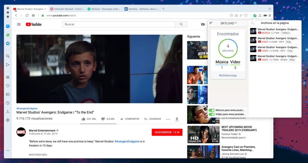 Sin embargo, sin instalas la versión para Opera desde la tienda de extensiones de Opera, no tendrás ninguna limitación para bajar audio o vídeo de YouTube. Todo lo que bajes lo tienes a la mano en el mismo gestor de descargas de Skyload, y toda la información sobre los archivos se muestra antes de que descargues algo: tamaño, bitrate, calidad de vídeo, tipo de archivo.
