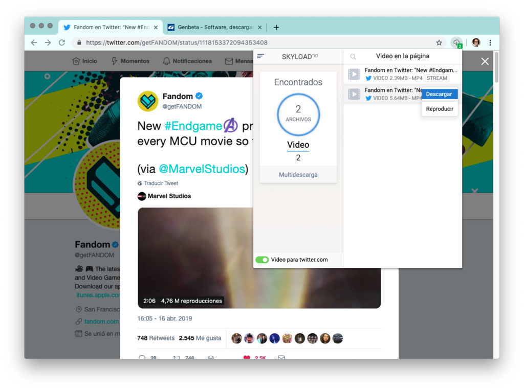 La extensión funciona con cualquier navegador basado en Chrome, como Vivaldi, Opera, Yandex, o el nuevo Edge. Skyload te deja bajar vídeo o audio de sitios como Twitter, Instagram, Facebook, YouTube, Vimeo, DailyMotion, Soundcloud, etc.
