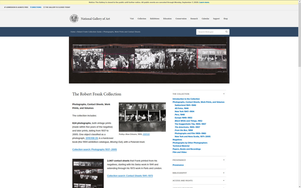 Robert Frank nos dejó hace poco tiempo, el 9 de septiembre de 2019. Desde los años noventa empezó a donar parte de su material a este museo consciente de la necesidad de guardar su archivo para las generaciones futuras. Y la National Gallery lo recibió con mucho gusto. Me imagino que cualquier museo del mundo querría algo semejante en sus paredes: